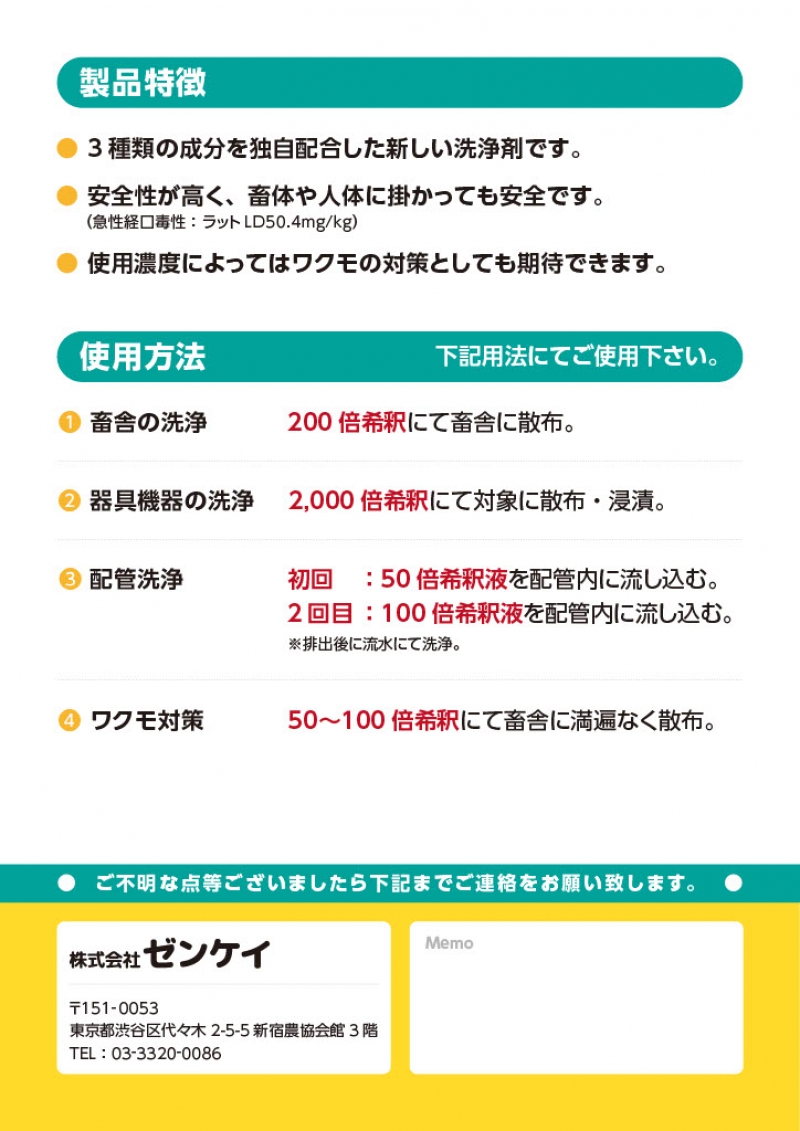 ◆製品名◆ ゼンケイ洗浄ワクモプラス ◆形態◆ 16ℓ(バックインボックス仕様) ◆推奨希釈倍率◆ 50~200倍希釈 ※用途により異なります ◆使用方法◆ 1.準備 (1)希釈液作成 ①先にゼンケイ洗浄を投入、水を注入完了後に攪拌 ②水に対して200倍希釈推奨(用途により異なります) (2)動噴機器本体、ノズルの圧力設定 ①動力噴霧器本体の圧力ダイヤルがある場合は低~中にし、噴出水が霧雨状になる程度に調整 ②ノズルからの放水設定は手元のダイヤルで直接放水ではなく、拡散放出設定で 2.散布方法